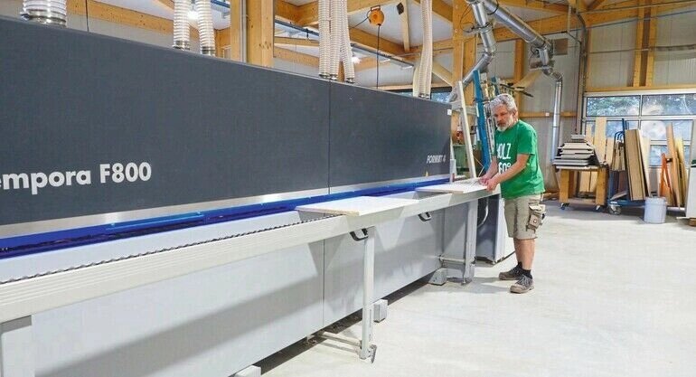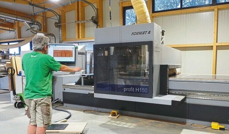 Herzstück der Produktion ist das CNC-Bearbeitungszentrum Format4 Profit H150. Die 5-Achs-Nestingmaschine ermöglicht über das Formatieren hinaus die rationelle Komplettbearbeitung inklusive aller Bohrungen, Nuten und Verbindungen in meist nur einem Arbeitsgang. Auch lassen sich natürlich Einzelteile beliebig auf Saugern oder Schablonen positionieren und CNC-bearbeiten.