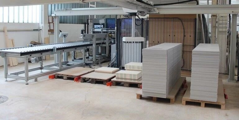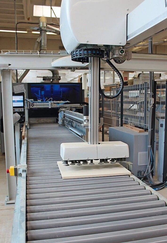 La solution d'automatisation chez Hoffmann combine un système de chargement et de déchargement à portique avec manipulateur à vide de Barbaric et un convoyeur à rouleaux motorisé pour l'amenage et le retour des pièces. La Creator 950 offrait pour cela une condition essentielle : elle ne travaille pas seulement en flux continu complet, mais aussi, au choix, en mode retour. Après l'usinage CNC, les pièces peuvent être ramenées du côté de l'entrée. Ce principe permet le chargement et le déchargement par l'avant de la machine. Après avoir appelé les programmes d'usinage dans la commande Woodflash de la CNC et effectué quelques saisies sur le terminal du système de chargement et de déchargement, le processus entièrement automatisé peut démarrer. Un fonctionnement entièrement autonome avec un lecteur de codes-barres intégré n'était pas pertinent en raison de la production de pièces identiques en grandes quantités, mais aurait été tout aussi possible.